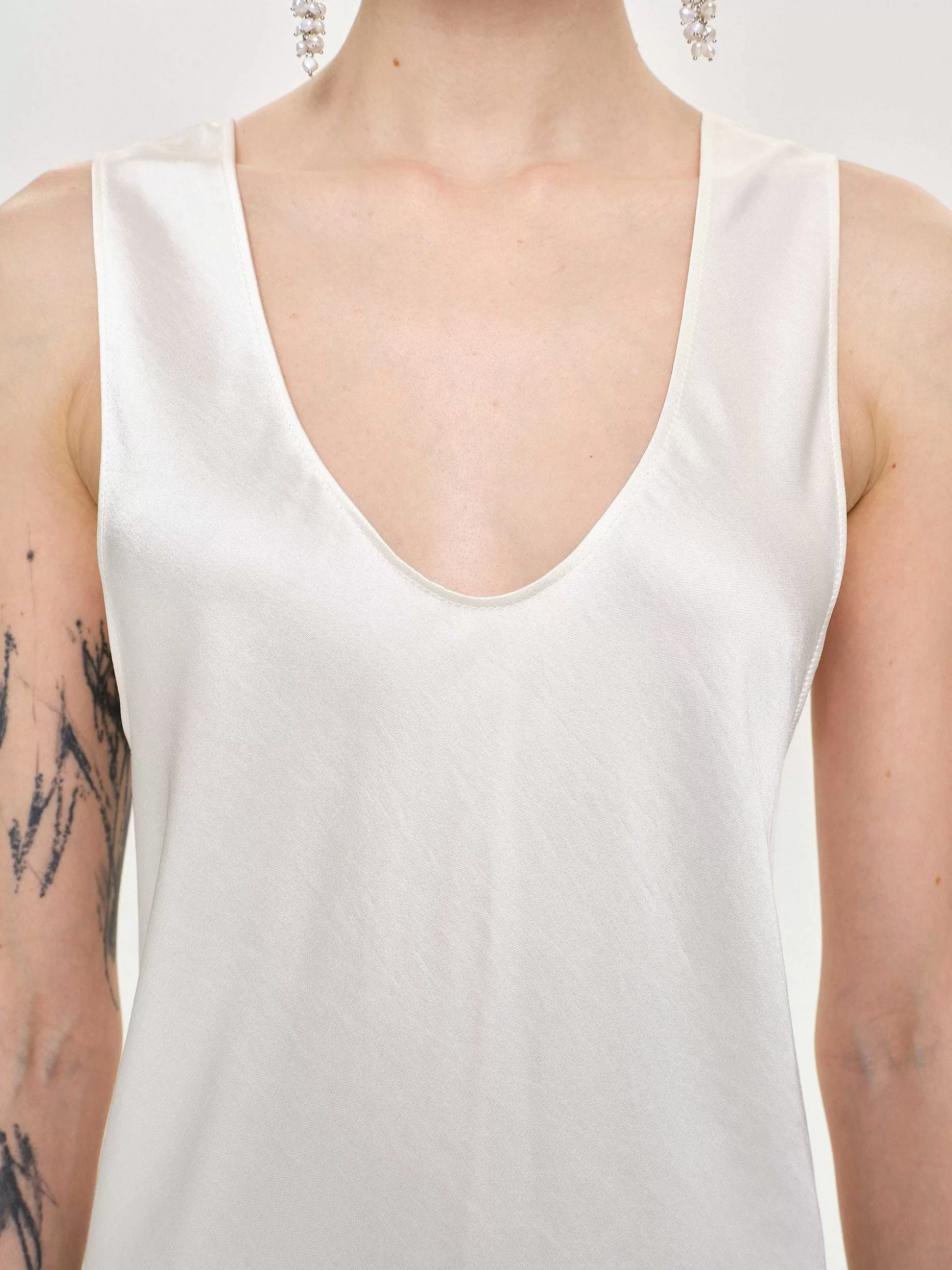 59% Rayon 41% PolyesterLightweight Satiny FabricSilky TouchRelaxed FitSleevelessDeep U-NecklineScooped Back DetailFlared…