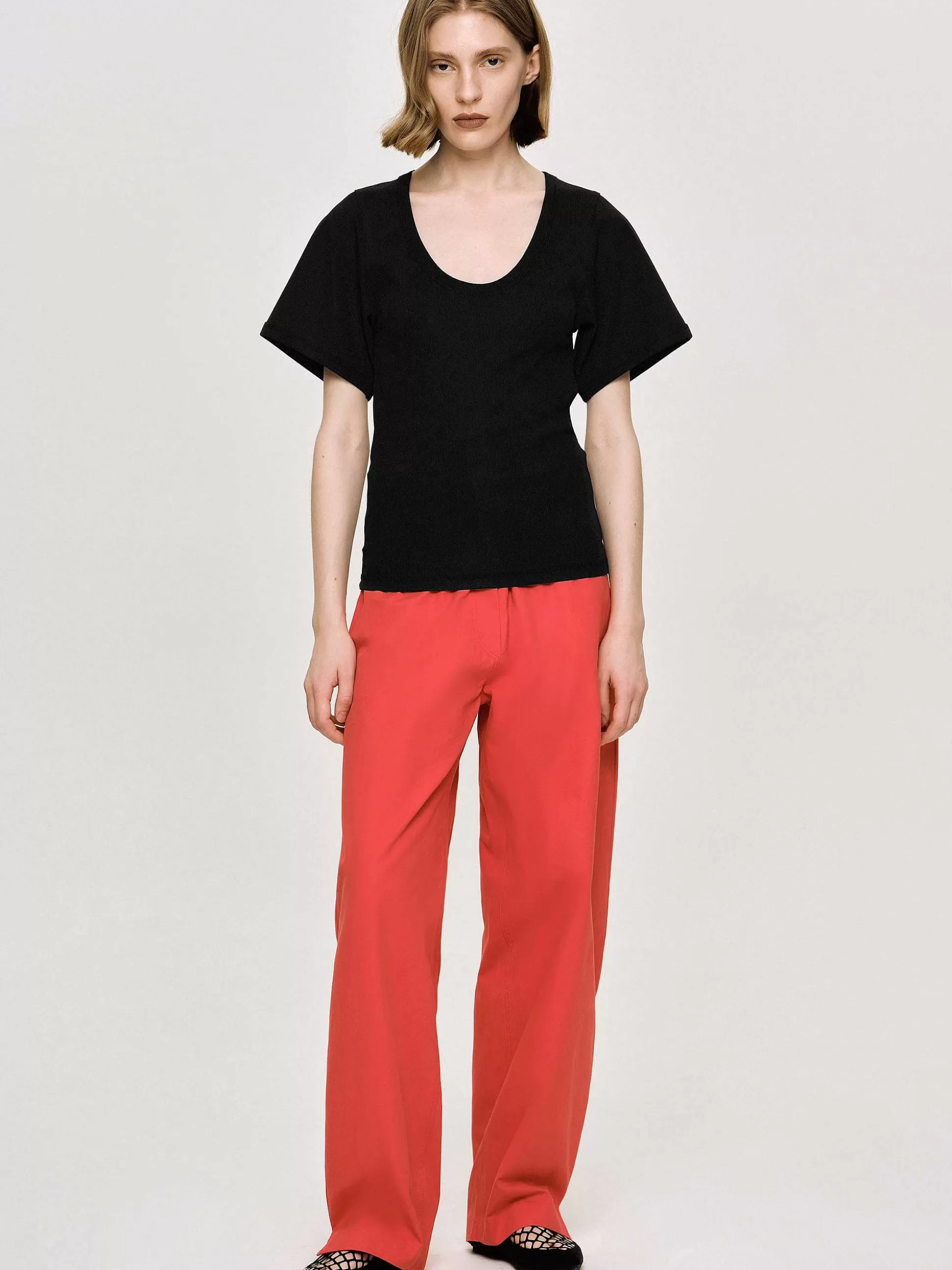 96% Polyester 4% SpandexLightweight Stretch Rib JerseyU-NecklineRib Knit CrewneckWaist LengthRegular FitDry CleanModel I…