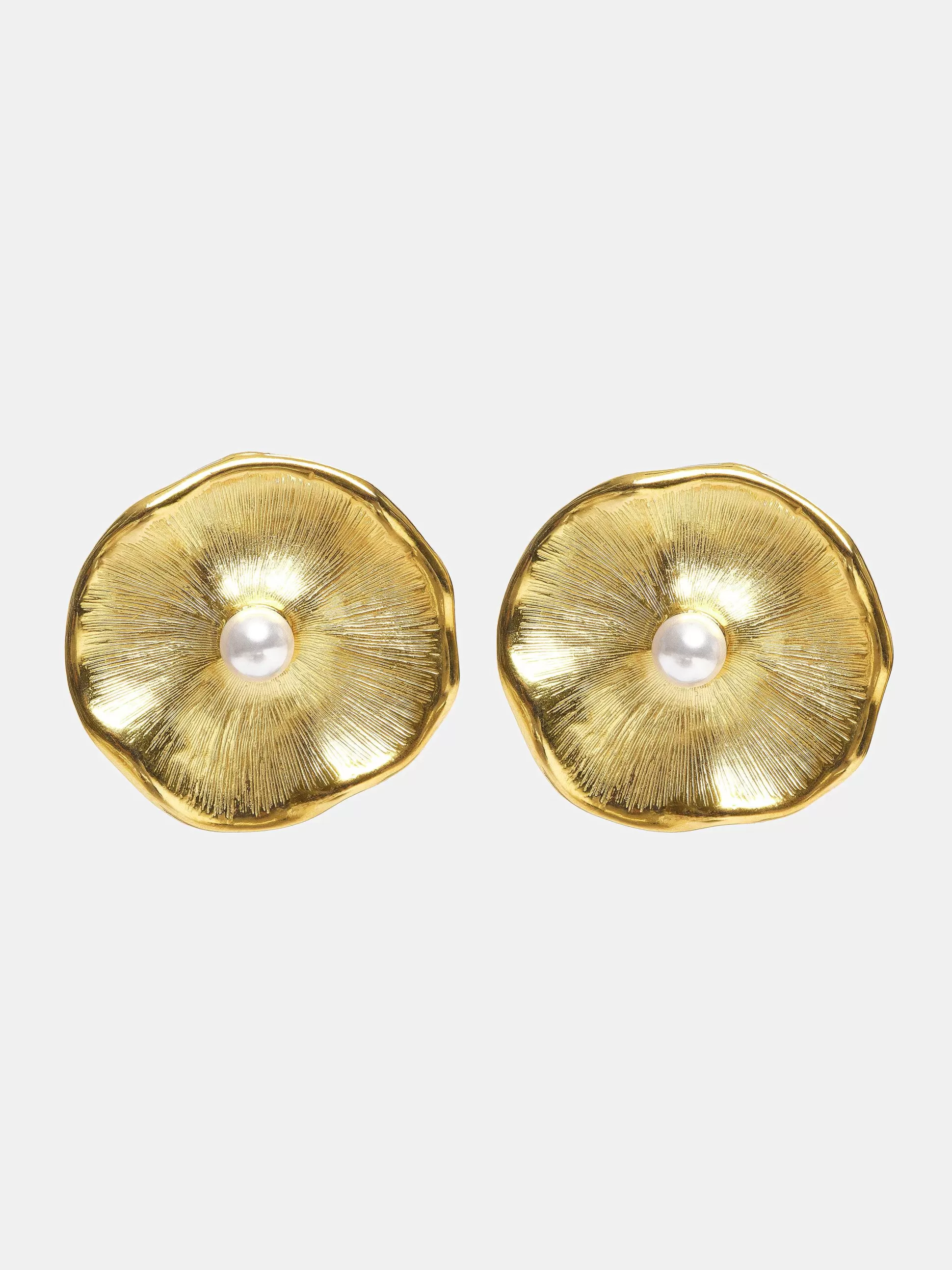 Gold-Plated BrassTextured Flower Motif Pearl At FaceMatte FinishPost-Stud Fastening For Pierced Ears 1.2″/3Cm W X 1.2″/3…